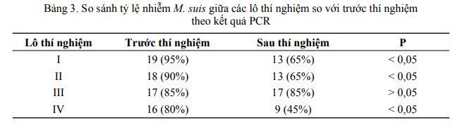 Như vậy có thể kết luận rằng, kháng sinh doxycycline là kháng sinh đặc hiệu trong việc điều trị M. suis. Tuy nhiên, sự cải thiện theo mức độ nhiễm chỉ có ý nghĩa khi được điều trị lâu dài với hai lần điều trị bằng kháng sinh (lô I, II và IV). Lô thí nghiệm không sử dụng doxycycline (lô III) thì hầu như không có hiệu quả trong điều trị M. suis. Mặt khác, dựa theo kết quả so sánh mức độ nhiễm M. suis trên heo sau cai sữa sau khi sử dụng các thuốc kháng sinh giữa các lô, mức độ nhiễm M. suis của heo sau khi sử dụng thuốc ở lô IV và lô I là thấp nhất và có giá trị khác biệt so với các lô II và III. Tức là, nếu sử dụng kết hợp kháng sinh doxycycline và nhóm kháng sinh khác cho hiệu quả điều trị tốt hơn so với việc điều trị không có kết hợp. Đánh giá mức độ nhiễm M. suis trên đàn heo dựa trên kết quả PCR Kết quả thể hiện trong Bảng 3 cho thấy, khi phân tích Chi-square để so sánh tỷ lệ dương tính với M. suis ở toàn lô trong suốt thí nghiệm so với trước khi thí nghiệm dựa theo phương pháp PCR, toàn bộ các lô thí nghiệm đều cho kết quả giảm tỷ lệ % các mẫu nhiễm M. suis trên heo thí nghiệm. Trong đó, tỷ lệ dương tính với M. suis ở lô IV là thấp nhất (với 45%) và cao nhất là ở lô III (85%). Tuy nhiên, sự khác biệt có ý nghĩa (P > 0,05) chỉ ghi nhận được ở các lô I, II và IV. Điều này có thể khẳng định được rằng, tương tự như kết quả đánh giá mức độ nhiễm bằng phương pháp nhuộm Giemsa, kháng sinh ở lô III dường như không có hiệu quả rõ ràng trong việc điều trị M. suis so với các lô còn lại.