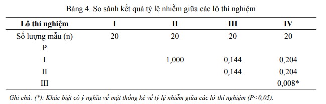 Ngoài ra, khi được so sánh thêm về sự khác biệt giữa các lô thí nghiệm (Bảng 4) sau hai lần điều trị bằng thuốc khác sinh, sự khác biệt có ý nghĩa về hiệu quả điều trị M. suis chỉ ghi nhận được giữa lô IV và lô III (P<0,05), các lô thí nghiệm còn lại không khác biệt có ý nghĩa (P>0,05). Như vậy, với kết quả ở Bảng 3 và 4 đã cho thấy, lô thí nghiệm IV (bactrim và doxycycline) có hiệu quả điều trị M. suis tốt nhất.