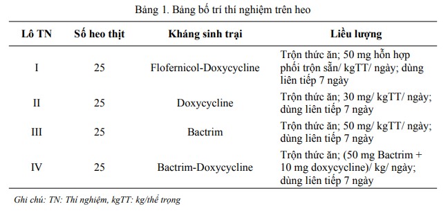 Vật liệu nghiên cứu Đối tượng: 100 con heo con sau cai sữa 21-28 ngày tuổi có khối lượng trung bình 5-7 kg, có dấu hiệu lâm sàng chung của bệnh M. suis như thiếu máu, niêm mạc nhợt nhạt, gầy còm với sự đồng đều về khối lượng lượng, giới tính, độ tuổi. Ô chuồng thí nghiệm: Mỗi ô chuồng TN có diện tích 30m2 , nền xi măng có độ dốc thích hợp để thoát nước, máng ăn tự động có gắn hệ thống nước để làm giảm độ bụi của thức ăn. Nước được cung cấp bằng núm uống tự động. Ô chuồng của các lô được bố trí trong cùng một dãy. Thức ăn: Trong tuần đầu, sau khi chuyển heo vào chuồng TN, cho heo ăn hạn chế để tránh tiêu chảy, sau đó cho ăn tự do. Các kháng sinh sử dụng trong TN được trộn vào thức ăn để khảo sát. Thời gian và địa điểm nghiên cứu Thí nghiệm (TN) được tiến hành tại một trại chăn nuôi heo thuộc tỉnh Bình Dương. Các xét nghiệm tìm và phát hiện vi khuẩn M. suis trong mẫu máu heo tại phòng lab Hàn-Việt, Đại học Nông Lâm TP. Hồ Chí Minh. Các mẫu máu kiểm tra chỉ tiêu sinh lý, sinh hóa được gửi đến Phòng khám đa khoa Ái Nghĩa, P. Tân Hiệp, TP. Biên Hòa, Đồng Nai, từ tháng 7/2020 đến tháng 12/2020. Phương pháp nghiên cứu Bố trí thí nghiệm Đàn heo cai sữa được lấy máu đem đi xét nghiệm tìm M. suis. Nếu trang trại được xác nhận nhiễm M. suis thì sẽ được tiến hành bố trí TN. Heo được lựa chọn mẫu ngẫu nhiên theo cách bốc thăm và được chia vào 4 lô, mỗi lô 25 con. TN được bố trí theo mẫu hoàn toàn ngẫu nhiên 1 yếu tố với yếu tố TN là kháng sinh được phân phối vào 4 lô như Bảng 1.