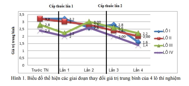 Đánh giá mức độ nhiễm M. suis trên đàn heo thí nghiệm qua vết phết máu nhuộm Giemsa Kết quả khi so sánh mức độ nhiễm M. suis theo thang điểm tại Bảng 2 cho thấy không có sự khác biệt về mặt thống kê giữa 4 lô tại thời điểm trước thí nghiệm. Sau thời gian điều trị với 2 lần cấp thuốc cách nhau 30 ngày, toàn bộ các lô thí nghiệm đều cho kết quả mức độ nhiễm giảm, thể hiện qua các điểm số trung bình. Trong đó, giá trị trung bình sau khi được cấp thuốc điều trị ở lô III (2,2) cao hơn lô I (1,6) và IV (1,4) với sự khác biệt có ý nghĩa thống kê (P < 0,05).