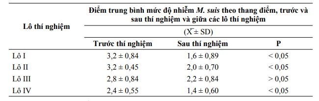 Bảng 2. Kết quả so sánh mức độ nhiễm M. suis theo thang điểm, trước và sau thí nghiệm và giữa các lô thí nghiệm
