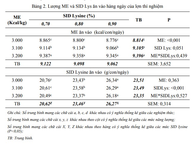 Phân tích ảnh hưởng của từng yếu tố thí nghiệm đến số lượng ME và SID Lys ăn vào của lợn, kết quả nghiên cứu cho thấy, cả hai chỉ số này đều bị tác động mạnh trong khẩu phần. Trong khi, ME (Kcal/ngày) ăn vào hàng ngày chịu chi phối bởi yếu tố ME thì số gam SID Lys nhận được lại phụ thuộc rõ rệt vào hàm lượng SID Lys khẩu phần (P<0,001). Lượng ME ăn vào tăng tỷ lệ thuận với mật độ ME trong khẩu phần, cao nhất ở mức năng lượng 3.200 kcal/kg với trung bình là 9.396 kcal/con/ngày, tiếp đến là mức năng lượng 3.100 kcal/kg (9.105 kcal/con/ngày) và thấp nhất là trong mức 3.000 kcal/kg (8.814 kcal/con/ngày). Số gam SID Lys ăn vào tăng theo hàm lượng SID Lys khẩu phần, cao nhất là ở SID Lys 0,90%, tiếp đến là mức 0,80%, thấp nhất là ở 0,70% (tương ứng với 26,27; 23,46 và 20,62 g/con/ngày). Như vậy, khi khẩu phần ăn cho lợn đực làm việc có mật độ ME và SID Lys thấp đã làm giảm đáng kể lượng ME và SID Lys thu nhận. Xét về sự tương tác của 2 yếu tố ME và SID Lys, trong cùng mật độ năng lượng trao đổi, các tỷ lệ SID Lys khác nhau trong khẩu phần không làm ảnh hưởng đến số lượng ME ăn vào nhưng đã làm thay đổi lượng SID Lys thực tế nhận được ở lợn đực làm việc. Cụ thể, số gam SID Lys ăn vào thấp nhất ở những nghiệm thức có mức SID Lys 0,70% với lượng trung bình dao động từ 20,49-20,76 g/con/ngày, cao nhất ở nhóm nghiệm thức sử dụng 0,90% SID Lys, trung bình 26,18-26,34 g/con/ngày. Ở chiều ngược lại, ở cùng hàm lượng SID Lys, các mật độ ME khác nhau đều không ảnh hưởng đến số lượng SID Lys thu nhận nhưng đã tác động đến số kcal ME ăn vào, cao nhất ở nhóm nghiệm thức 3.200 kcalME/kg (đều trên 9.300 kcal/con/ngày), thấp nhất ở những nghiệm thức 3.000 kcalME/kg (chỉ nhận được ít hơn 8.900 kcal/con/ngày). Kết quả về khả năng sản xuất tinh của lợn đực thí nghiệm Thể tích tinh dịch của lợn trong các nghiệm thức thí nghiệm là khá cao, biến động khoảng 294 đến 300 ml/con và có khuynh hướng tăng theo hàm lượng SID lys khi năng lượng trao đổi trong khẩu phần ăn của lợn đực ở mức thấp (3.000 kcal/kg). Nếu mật độ ME cao hơn hoặc bằng 3.100 kcal thì thể tích tinh dịch thu được trung bình sau mỗi lần khai thác lại có xu hướng giảm khi mức SID lys trong khẩu phần cao hơn 0,80%. Tuy nhiên các mức tăng giảm này đều chưa có ý nghĩa về thống kê (P>0,05). Tác động của dinh dưỡng khẩu phần thể hiện rõ qua chất lượng tinh dịch, sự khác biệt có ý nghĩa đều được ghi nhận ở tất cả các chỉ tiêu (P<0,05). Sự ảnh hưởng cộng gộp từ hai nhân tố ME và SID lys trong khẩu phần đã làm thay đổi cả hoạt lực, mật độ cũng như tổng mật độ tinh trùng có hoạt lực ở đực giống. Chất lượng tinh dịch là tốt nhất ở nhóm lợn được ăn khẩu phần 3.100 kcal ME với 0,80% SID Lys (NT B2, tương ứng đạt 84,62% về hoạt lực; mật độ 340,30 triệu tinh trùng/ml và 86,02 tỷ tinh trùng có hoạt lực ở mỗi lần khai thác), thấp nhất ở những lợn có chế độ ăn chỉ 3.000 kcal ME với 0,70% SID Lys (NT A1, không đến 80,30 tỷ tinh trùng có hoạt lực ở mỗi lần khai thác). Kết quả ở Bảng 3 cũng chỉ ra, khi ME và SID Lys trong khẩu phần quá cao, đã có xu hướng làm giảm chất lượng tinh ở đực giống, sự sụt giảm nghiêm trọng khi ME và SID Lys cùng ở mức cao (NT C3). Mật độ và tổng mật độ tinh trùng có hoạt lực trung bình ở mỗi lần khai thác chỉ cao hơn ở NT A1 không đáng kể, thậm chí hoạt lực lại có xu hướng thấp hơn. Đánh giá tác động của từng nhân tố thí nghiệm, kết quả nghiên cứu cho thấy, tăng hàm lượng SID Lys khẩu phần từ 0,70% lên 0,80% đã có xu hướng cải thiện tất cả các chỉ tiêu về chất lượng tinh ở lợn đực, sự gia tăng là rõ rệt nhất ở mật độ tinh trùng có trong 1 ml tinh dịch (nhiều hơn 3 triệu tinh trùng). Khi SID Lys ở mức cao (0,90%), ngoại trừ hoạt lực tinh trùng, cả mật độ và tổng mật độ tinh trùng có hoạt lực đều có khuynh hướng giảm so với ở mức 0,7%, tuy nhiên, các chênh lệch này là chưa có ý nghĩa (P>0,05). Ở yếu tố ME, mức độ ảnh hưởng chưa rõ rệt chỉ được ghi nhận ở chỉ tiêu thể tích tinh dịch (P>0,05). Chất lượng tinh dịch trung bình từ 10 lần khai thác đã bị chi phối bởi mật độ ME trong khẩu phần ăn của đực giống, sự khác biệt có ý nghĩa đã xuất hiện ngay ở chỉ tiêu hoạt lực tinh trùng (P<0,01). Các chênh lệch có ý nghĩa khi tăng ME khẩu phần tăng từ 3.000 lên 3.100 kcal/kg, khi ME tăng tới 3.200 kcal/kg thì chất lượng tinh dịch không còn khác biệt so với ở 3.000 kcal/kg. So với chất lượng tinh dịch của lợn ở hai nhóm khẩu phần còn lại, các chỉ số này ở những lợn trong nhóm khẩu phần 3.100 kcal/kg ME đã cải thiện từ 1,44-1,55%; 1,26-1,47% và 3,01-3,38% tương ứng với các chỉ tiêu hoạt lực, mật độ và tổng mật độ tinh trùng có hoạt lực trung bình mỗi lần khai thác.